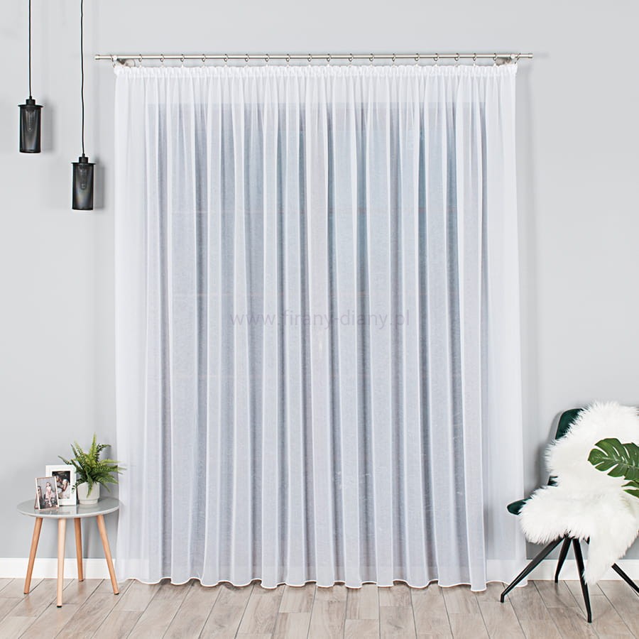 Elegancka firana długa z woalu kreszowanego w klasycznym białym kolorze to doskonały wybór do salonu, sypialni lub jadalni. Lekka i półprzezroczysta tkanina subtelnie rozprasza światło, nadając wnętrzu świeżości, lekkości i ponadczasowego stylu.
