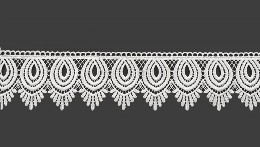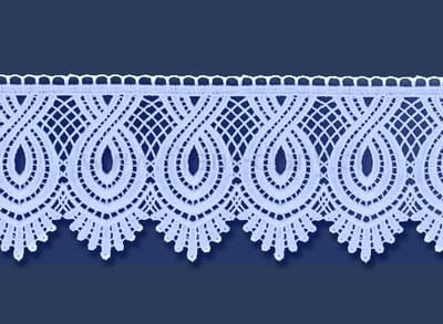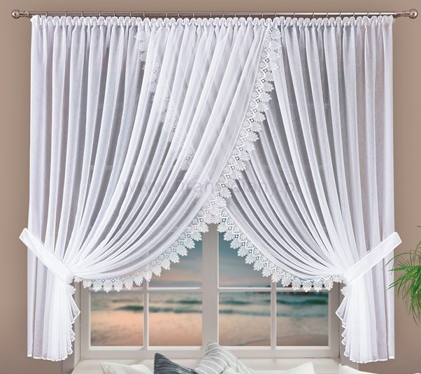 Firana ALICJA to elegancka biała firana z woalu kresz, ozdobiona dekoracyjną gipiurą o szerokości 10 cm. Efektowne upięcie „na boki” tworzy miękkie fale i nadaje oknu stylowy, harmonijny wygląd.