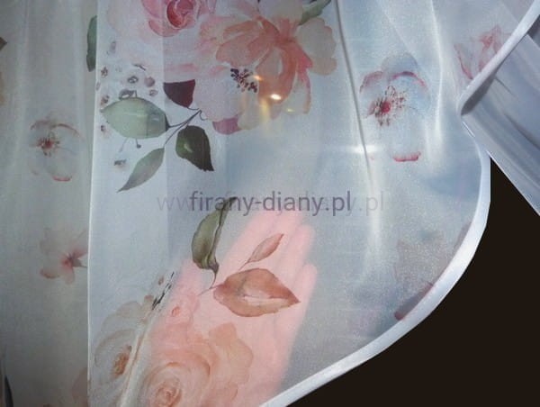 Lambrekin uszyty z drukowanego gładkiego woalu . Brzegi oblamowane białą atłasową lamówką. Góra wykończona białą kryzą zasłaniającą żabki lub haczyki. Tkanina przejrzysta, przepuszcza dużo światła.