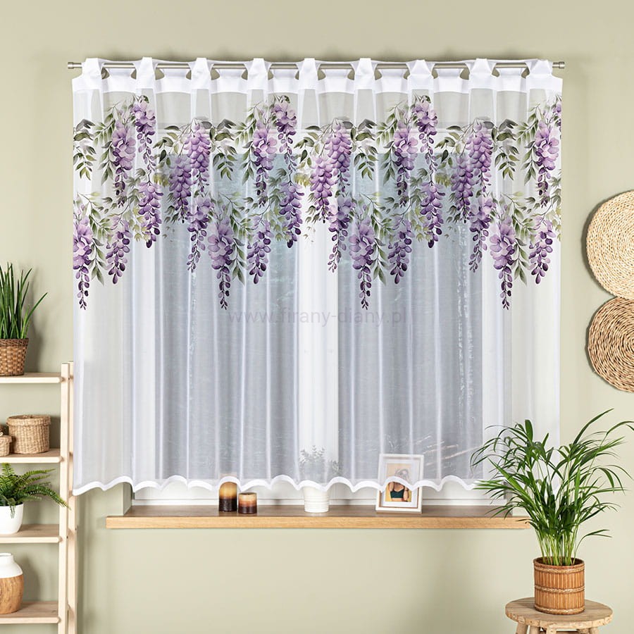 Nowoczesna firana balkonowa wykończona fabrycznie, wykona z przędzy żakardowej w fioletowe kwiatowe wzory. Cechuje ją dobra przepuszczalność powietrza i promieni słonecznych. Firana bardzo wygodna w użytkowaniu do zakładania na karnisz, nie potrzeba żabek ani haczyków.