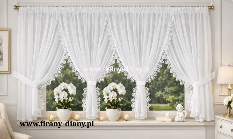 Boki firany zostały wykończone dekoracyjną gipiurą o szerokości 8 cm, a dół obszyty elegancką atłasową lamówką. Całość prezentuje się bardzo efektownie i nadaje wnętrzu klasycznego, a jednocześnie lekkiego charakteru.