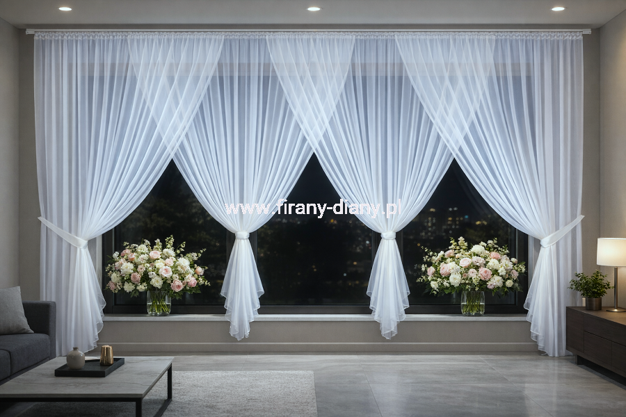Firana Natalia wykonana z wysokiej jakości białego woalu kreszowanego to elegancka dekoracja okna, idealna do salonu, pokoju dziennego oraz na szerokie okna tarasowe i balkonowe. Model z dwoma efektownymi kokonami oraz dekoracyjnie upinanymi bokami tworzy stylową i lekką aranżację okienną.