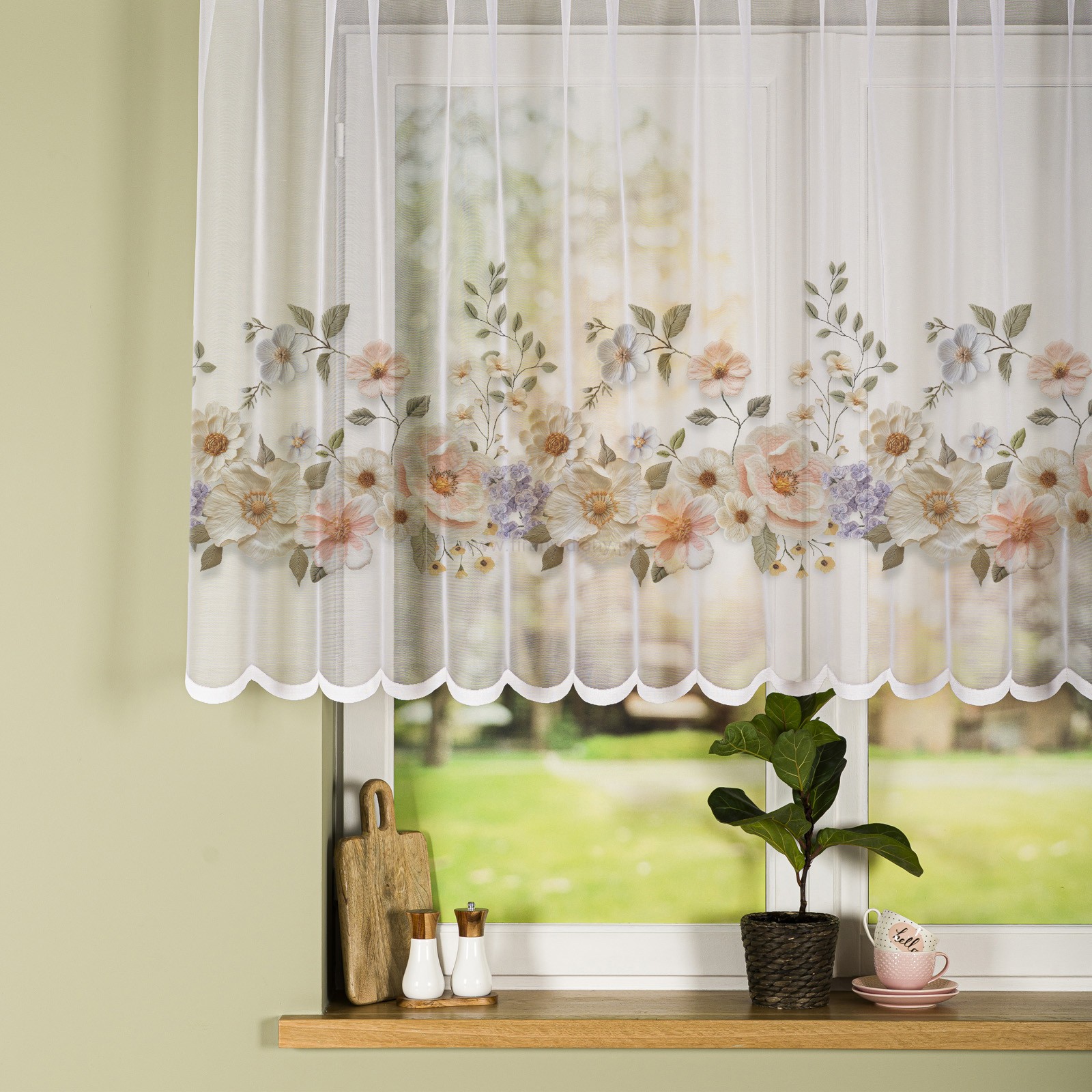 Uniwersalny wzór inspirowany naturą sprawia, że firana doskonale pasuje do wnętrz klasycznych, romantycznych oraz rustykalnych. Delikatne kolory i kwiatowa kompozycja wprowadzają do pomieszczenia przytulny klimat, a dekoracyjnie wykończony dół z falowaną linią dodaje jej elegancji.