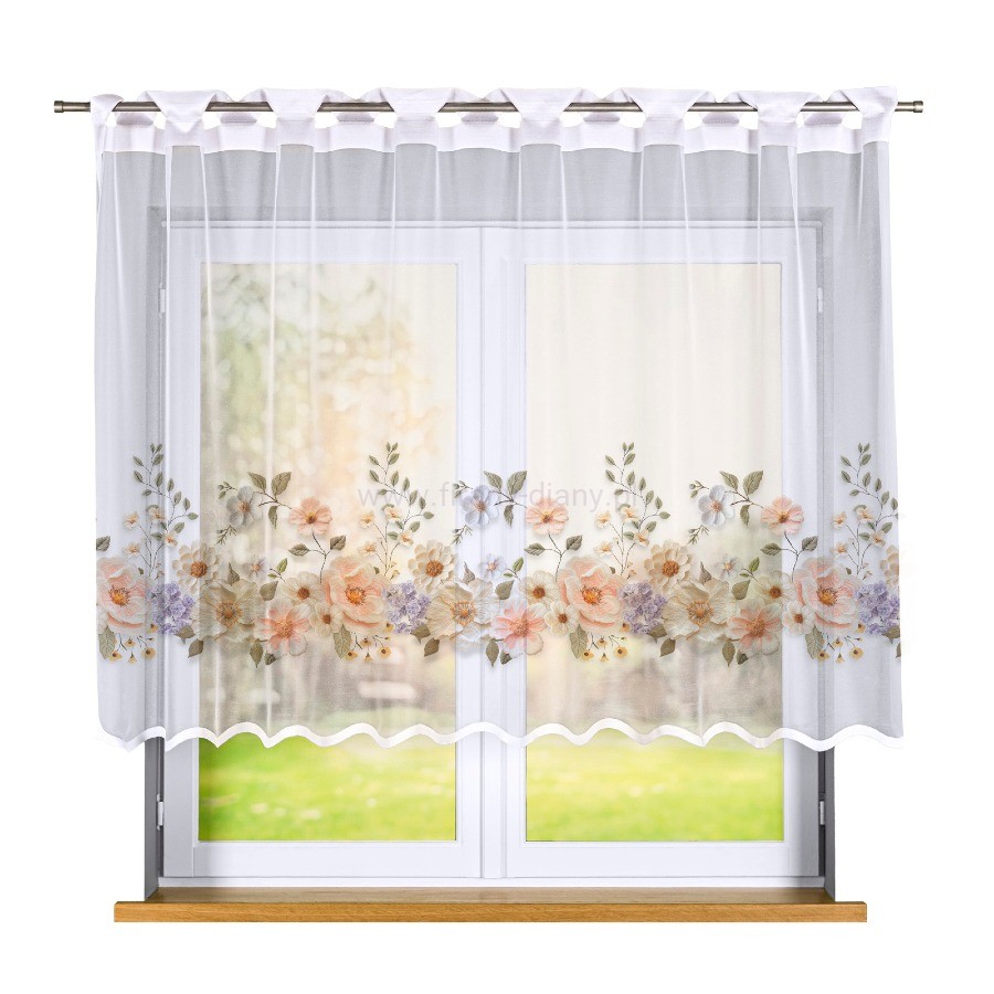 Dekoracyjny pas z motywem malowanych kwiatów umieszczony w dolnej części firany nadaje jej wyjątkowy styl. Jasna, półtransparentna tkanina pięknie przepuszcza światło dzienne, dzięki czemu pomieszczenie pozostaje jasne i przytulne, jednocześnie zachowując subtelną osłonę okna.