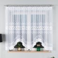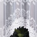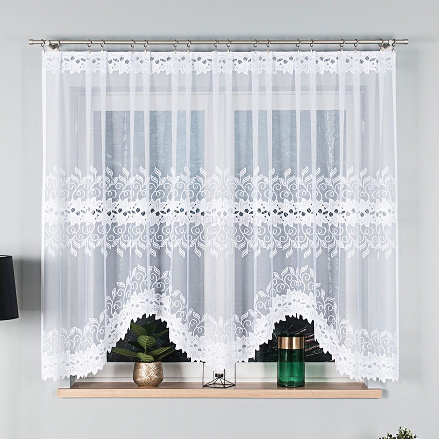 Firana żakardowa w kolorze białym z gęstym fantazyjnym wzorem. Firana wycięta w łuki. Klasyczny wzór pasuje do każdego pomieszczenia: kuchni, salony, sypialni. Firana konfekcjonowana, góra i boki wykończone fabrycznie.
