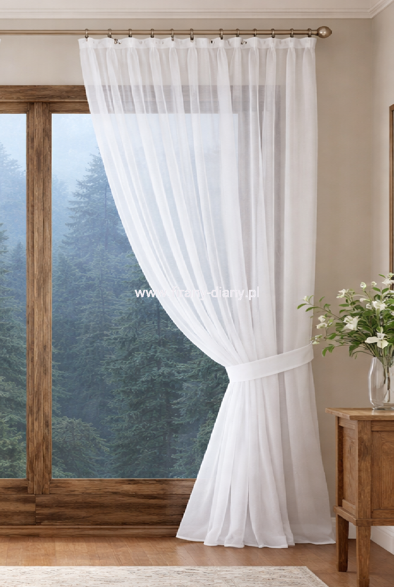 Firanka uszyta z woalu. Bok i dół firanki oblamowany białą atłasową lamówką. Firanka uszyta na taśmie marszczącej o szer. 5 cm typu smok. W komplecie szarfa do upięcia firany.