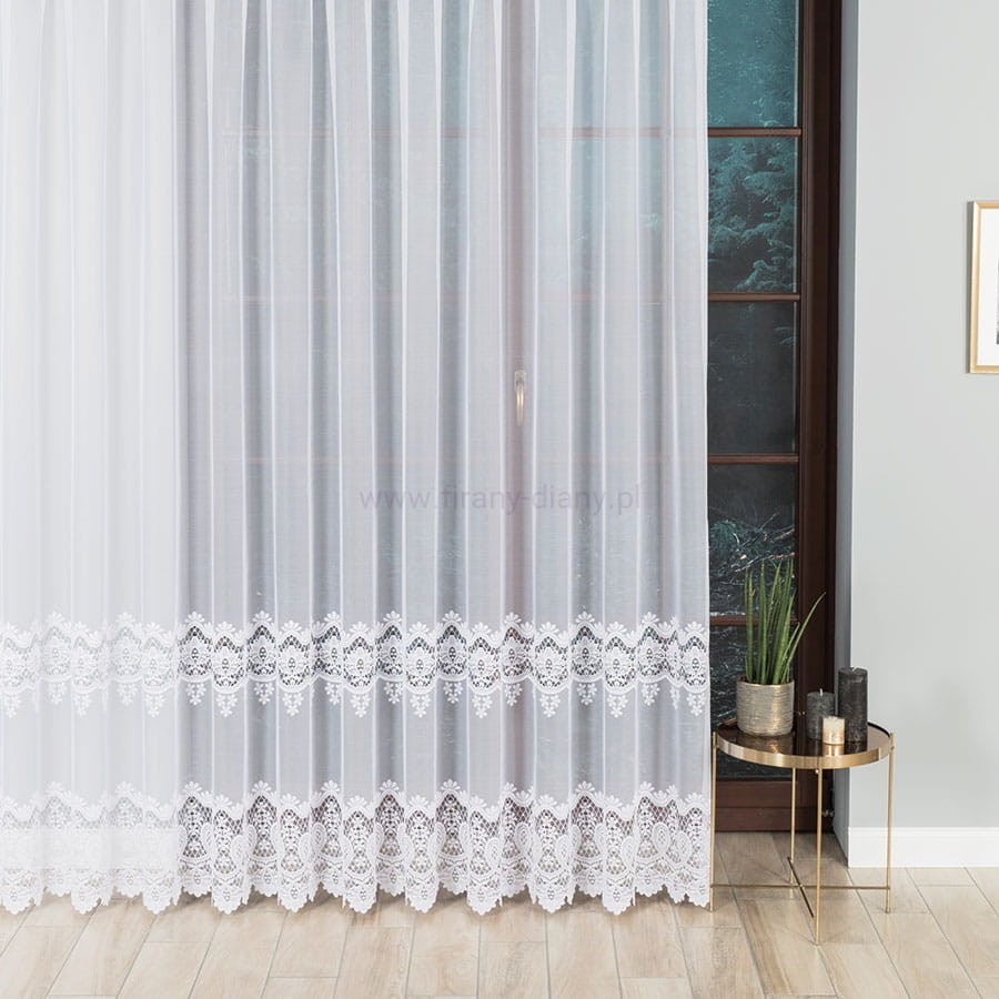 Elegancka firana żakardowa z delikatnym, koronkowym wykończeniem. Przepuszcza światło, dodaje wnętrzu lekkości i stylu. Idealna do salonu, sypialni i jadalni.