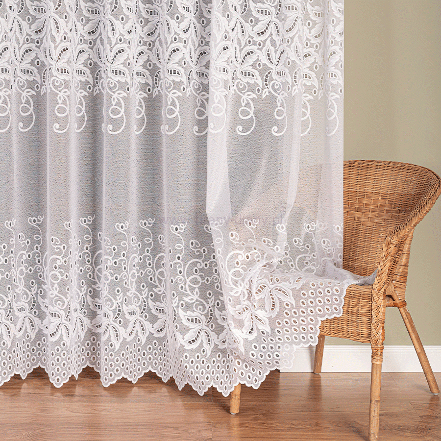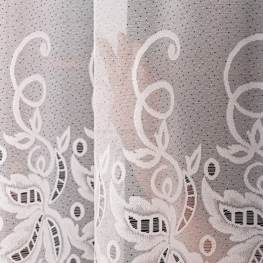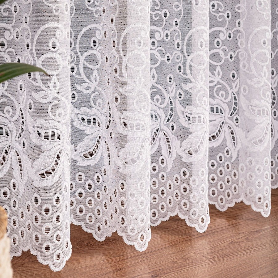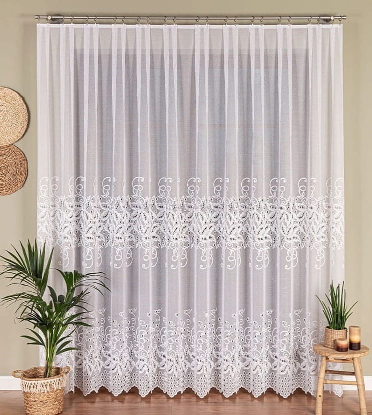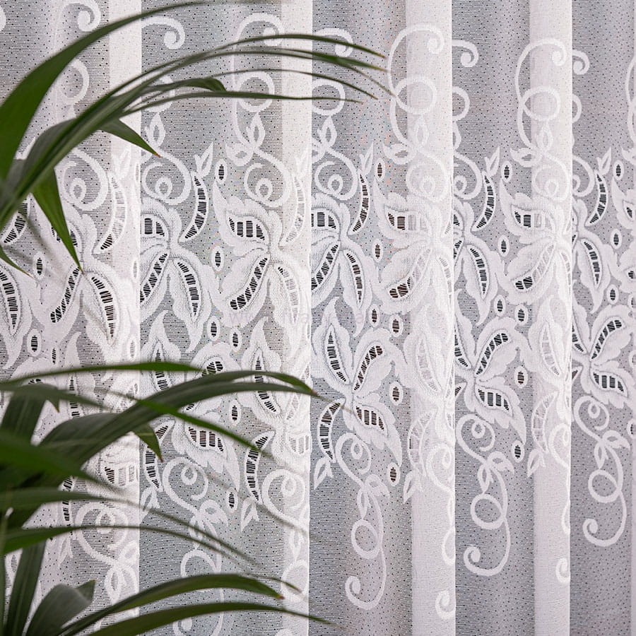 Klasyczna firana żakardowa szyta na taśmie typu smok o szer. 5 cm. Wzór na środku i dole firany wyglądem przypominający haft nadaje firanie wyjątkowego charakteru, dzięki czemu sprawdzi się w salonie, sypialni czy pokoju dziennym z wyjściem na balkon. Firana jest gotowa do zawieszeni - wystarczy umieścić ją na żabkach lub haczykach, aby natychmiast odmienić wygląd okna. To idealna propozycja dla osób, które szukają połączenia klasyki, funkcjonalności i efektownego wyglądu w jednym produkcie.