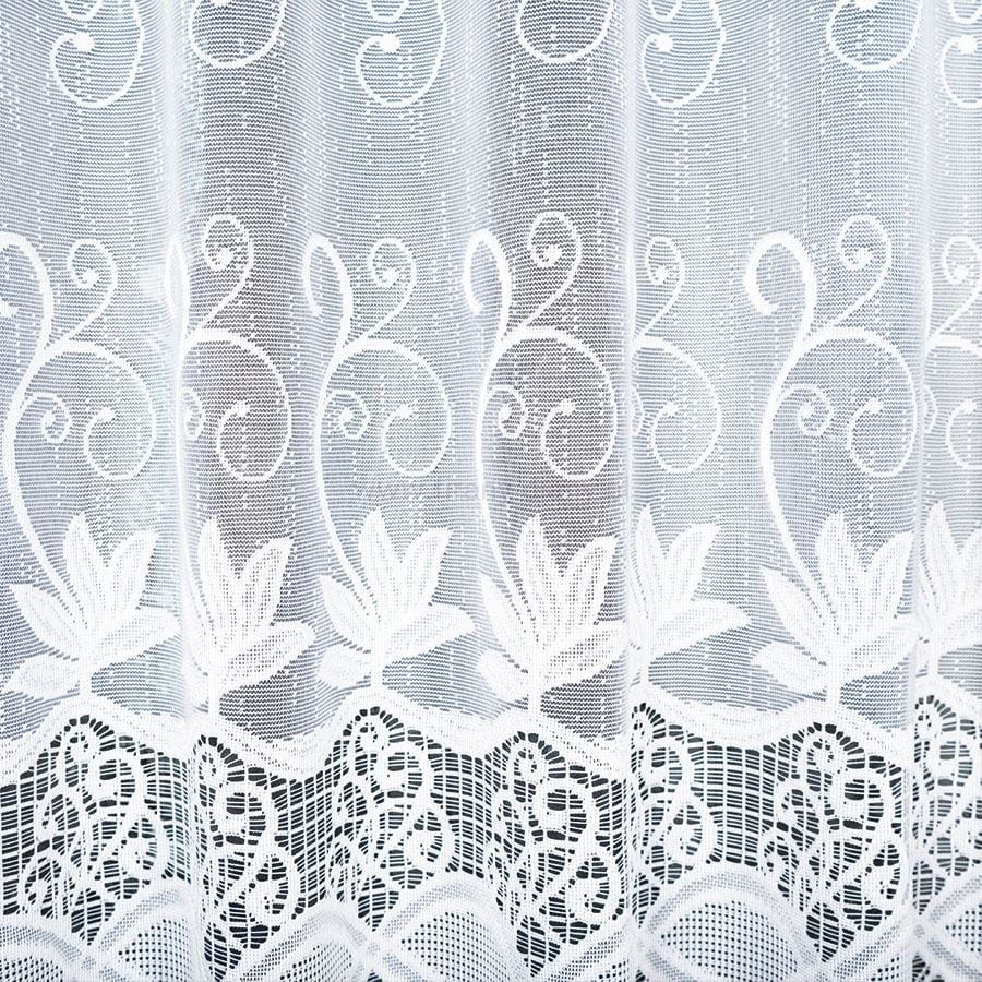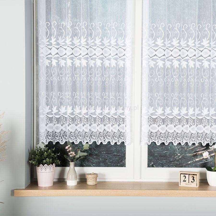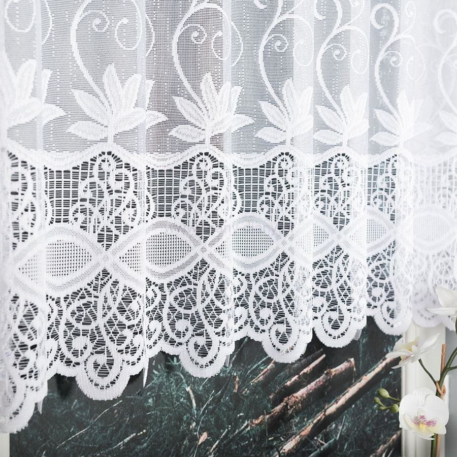 Firana żakardowa z gęstym dekoracyjnym wzorem, dostępna na wysokość 120 cm. Firana gotowa z obszytymi bokami do wsuwania na karnisz lub patyczek, idealne do kuchni lub jadalni.