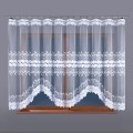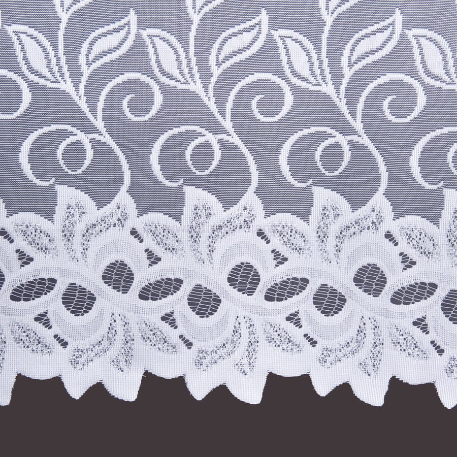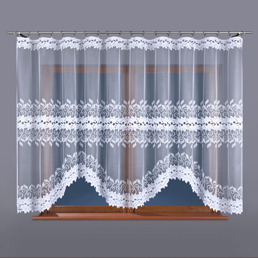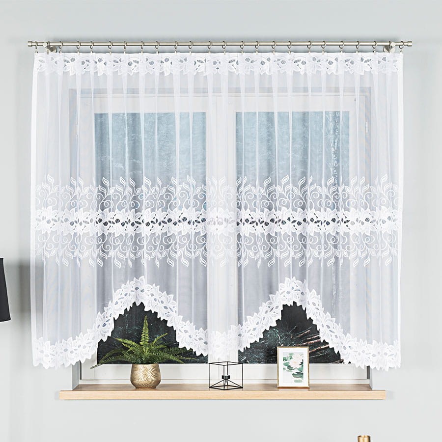 Firana żakardowa w kolorze białym z gęstym fantazyjnym wzorem. Firana wycięta w łuki. Klasyczny wzór pasuje do każdego pomieszczenia: kuchni, salony, sypialni. Firana konfekcjonowana, góra i boki wykończone fabrycznie.