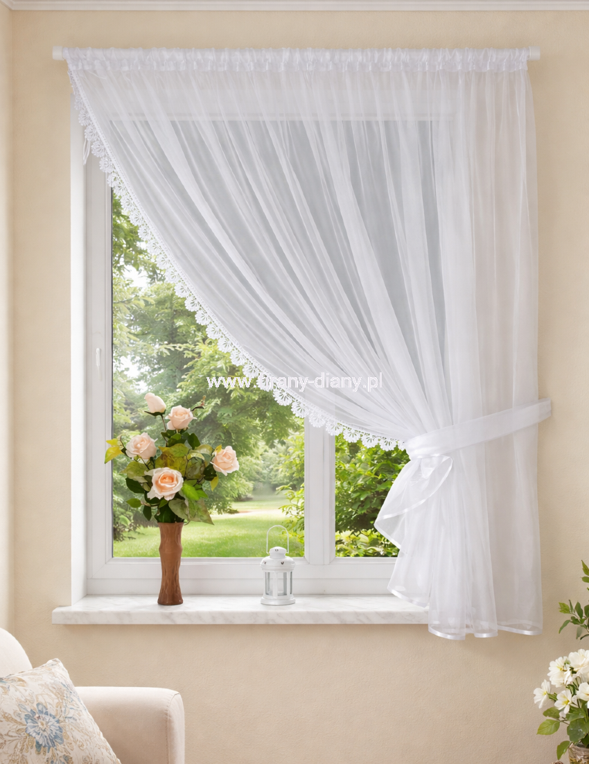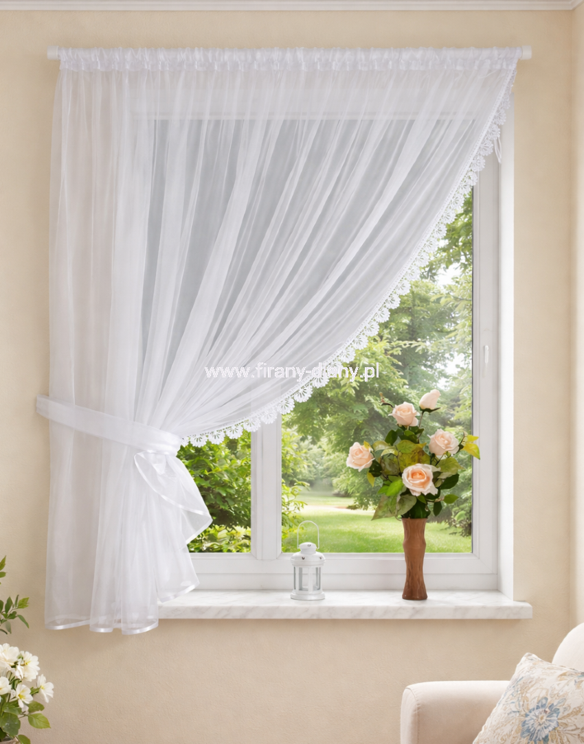 Firanka uszyta z woalu delikatnie kreszowanego w kolorze białym. Bok ozdobiony gipiurą o szer. 5 cm. Dół firanki oblamowany białą atłasową lamówką. Firanka uszyta na taśmie marszczącej o szer. 5 cm typu smok, można powiesić na żabkach, haczykach lub wsunąć karnisz między taśmę a materiał. Szarfa w komplecie. Idealna firana na wąskie okna w kuchni i salonie.