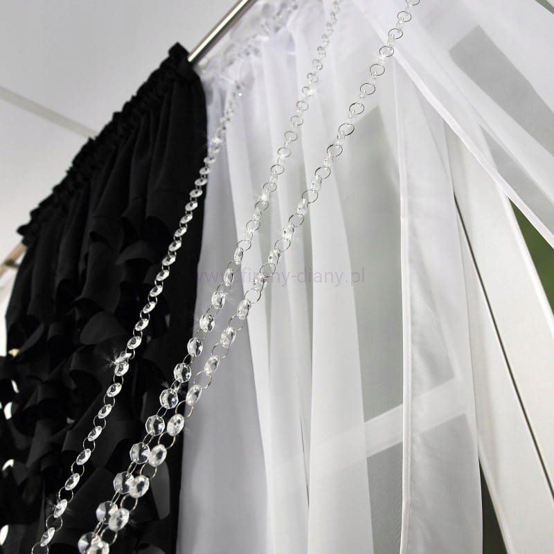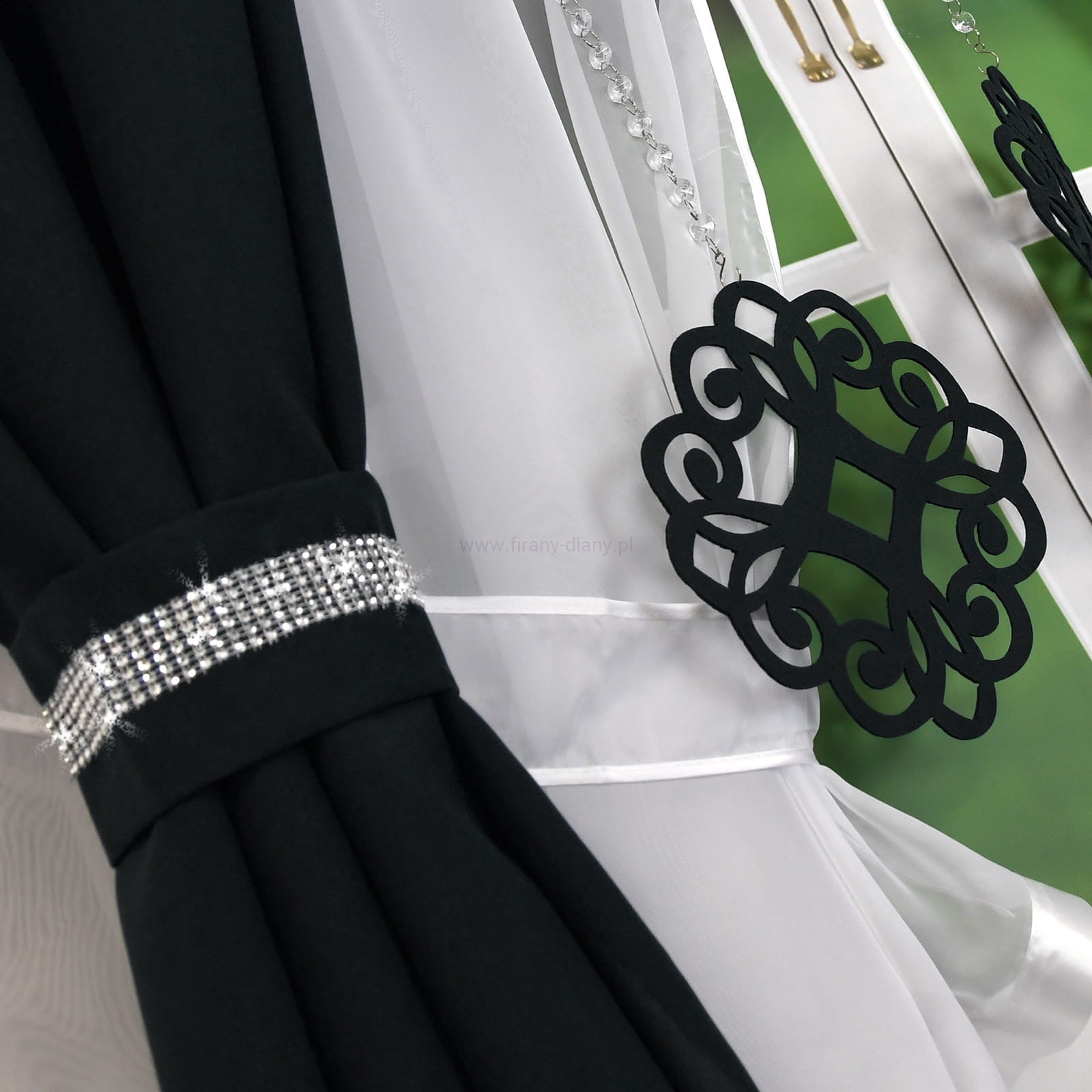 Do zestawu dołączone są 2 szarfy z woalu do upięcia firan, 2 tasiemki z cyrkoniami do upięcia zasłon, 3 ażurowe zawieszki z koralikami.