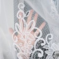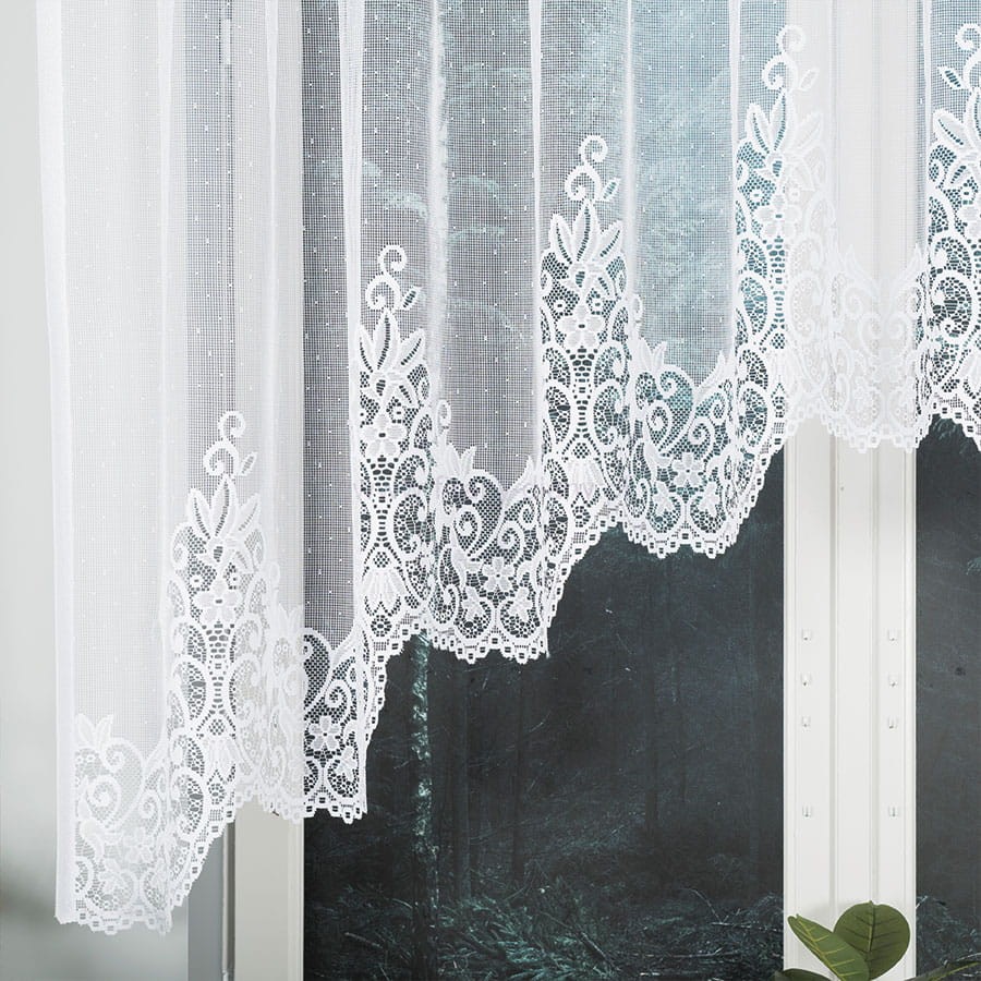 Firana żakardowa z kwiatowym wzorem wycięta w łuk. Konfekcjonowana bez taśmy, góra i boki wykończone fabrycznie. Firana w kolorze białym.