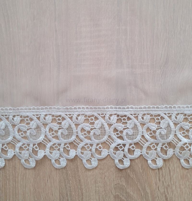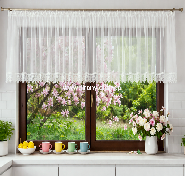 Dół wykończony ozdobną gipiurą o szerokości 10 cm. U góry wszyta taśma marszcząca typu smok o szer. 5 cm, dzięki której łatwo zawiesić firanę na żabkach lub haczykach. To idealna propozycja do kuchni, jadalni lub aneksu kuchennego.
