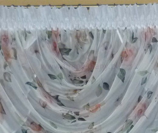 Lambrekin uszyty z drukowanego gładkiego woalu . Brzegi oblamowane białą atłasową lamówką. Góra wykończona białą kryzą zasłaniającą żabki lub haczyki. Tkanina przejrzysta, przepuszcza dużo światła.