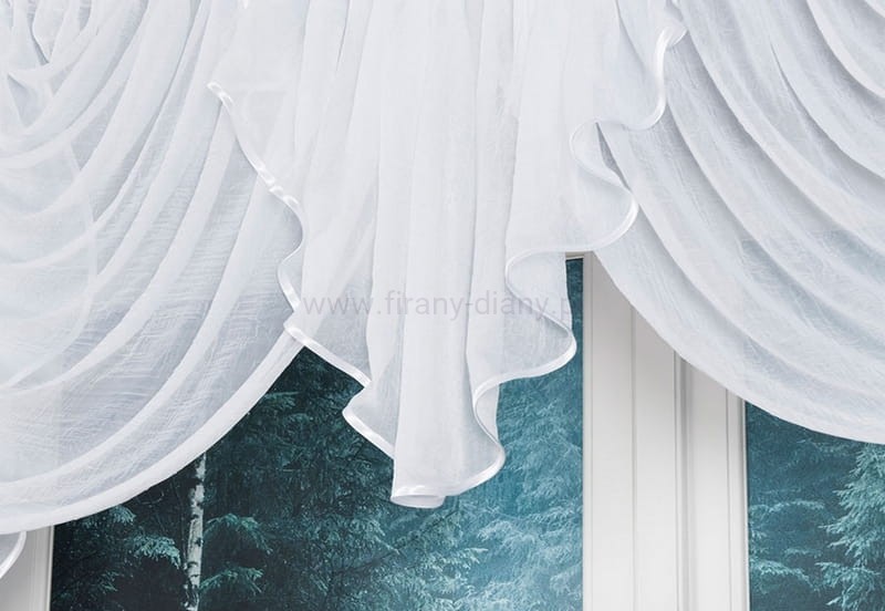 Lambrekin uszyty z woalu kreszowanego w kolorze białym. Brzegi firanki wykończone atłasową lamówką. Całość uszyta na jednej taśmie marszczącej typu smok o szer. 5 cm. Góra wykończona kryzą zasłaniającą żabki lub haczyki.