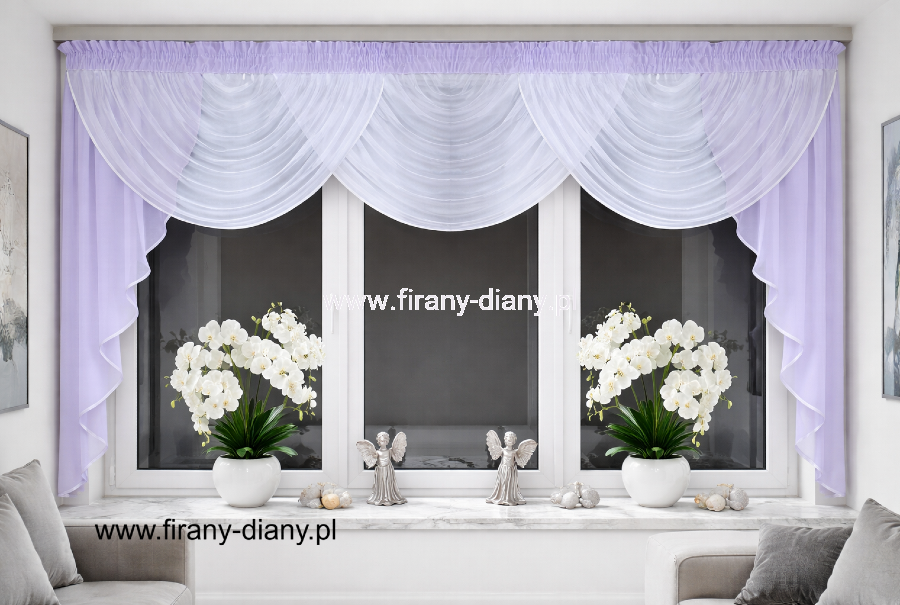 Stylowy lambrekin z fioletowymi bokami to wyjątkowa dekoracja okna, która łączy elegancję z subtelną dziewczęcą estetyką. Wykonany z lekkiego woalu kreszowanego, pięknie rozprasza światło i nadaje wnętrzu przytulny, romantyczny charakter.