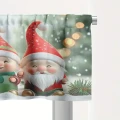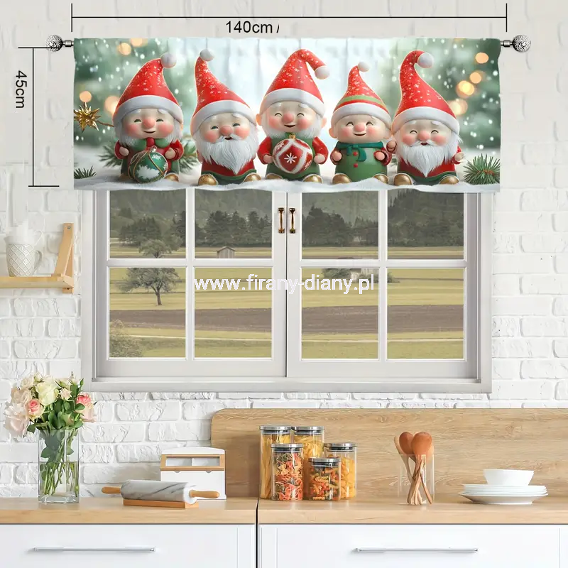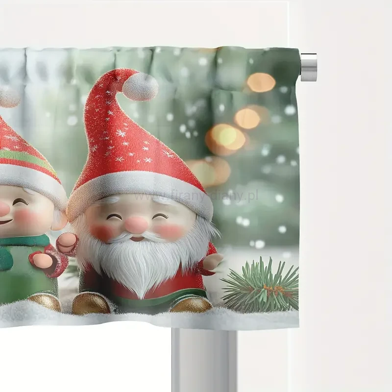 Krótka firanka w żywych kolorach na Święta Bożego Narodzenia. Wzór Mikołajki, skrzaty. Lambrekin można powiesić na żabkach lub wsunąć na karnisz.
