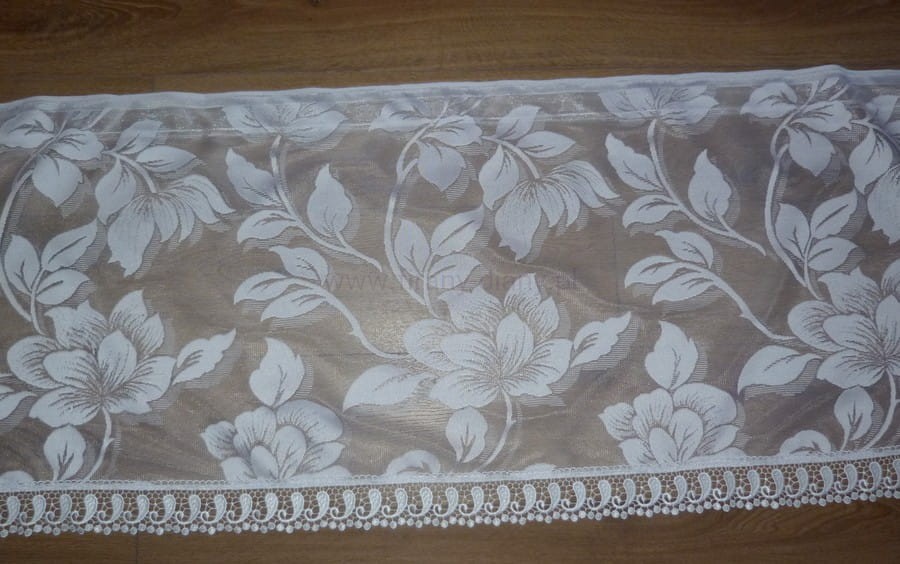 Lambrekin z tkaniny żakardowej w duże kwiaty , uszyty na taśmie marszczącej typu smok. Dół obszyty gipiurą o szer.5 cm. Firana do wieszania na żabki lub haczyki. Wsuwając patyczek między taśmę a materiał lambrekin może służyć jako zazdrostka.