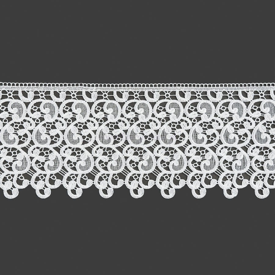 Lambrekin z woalu gładkiego w kolorze białym. Krótka firana uszyta na taśmie marszczącej typu smok o szer. 5 cm. Dół obszyty koronkową gipiurą o szer. 20 cm. Firana do wieszania na żabki lub haczyki.