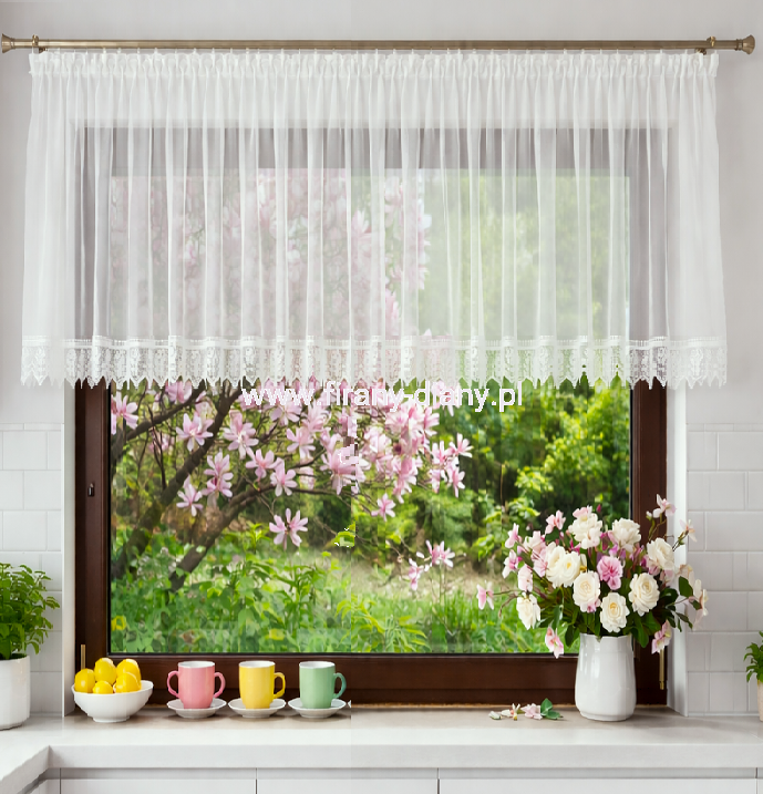 Krótka firana z woalu doskonale pasuje na okno w kuchni i jadalni.