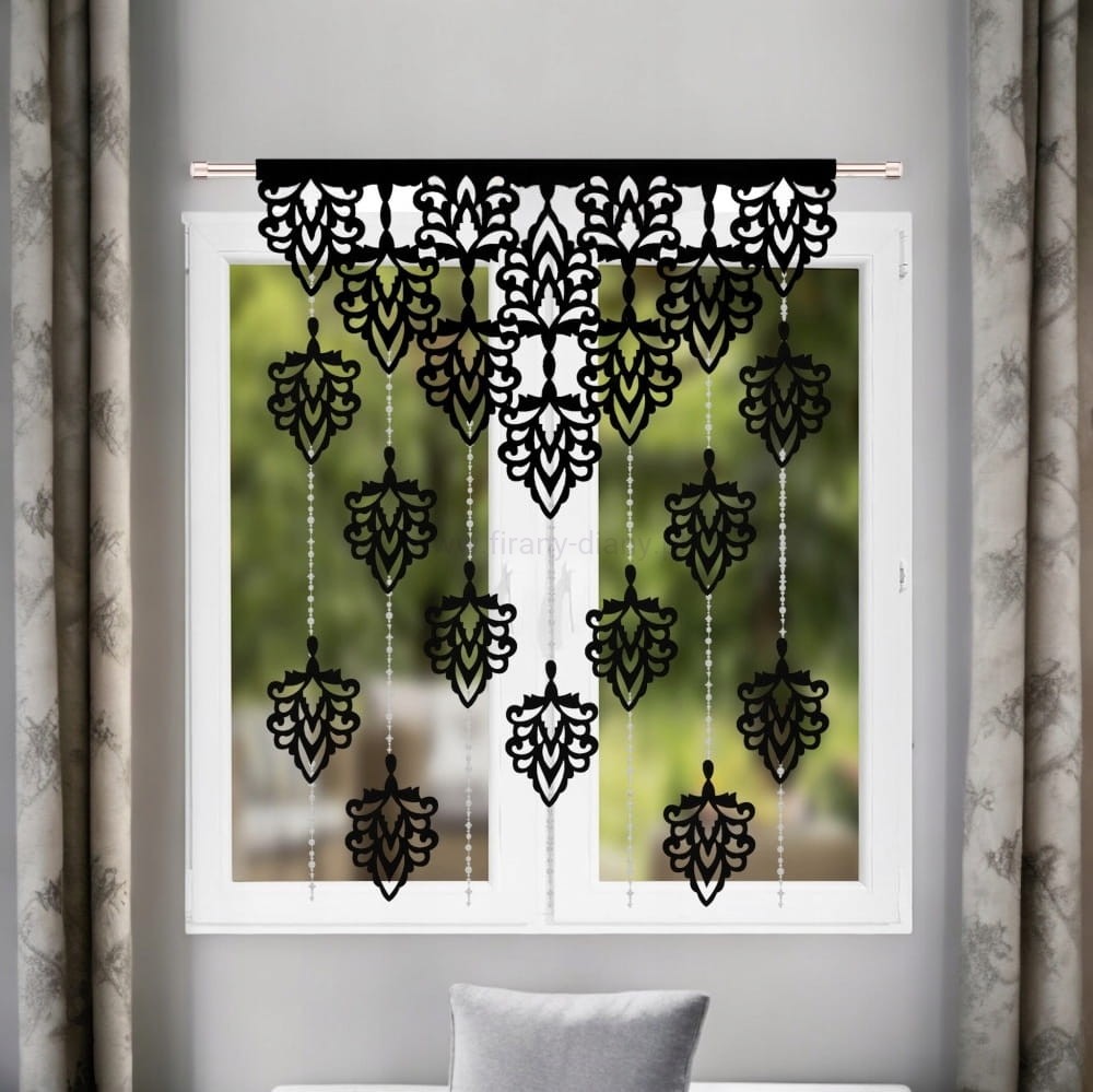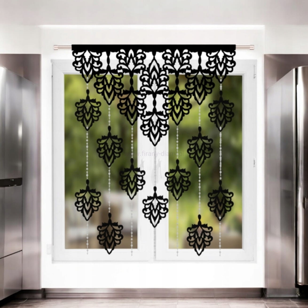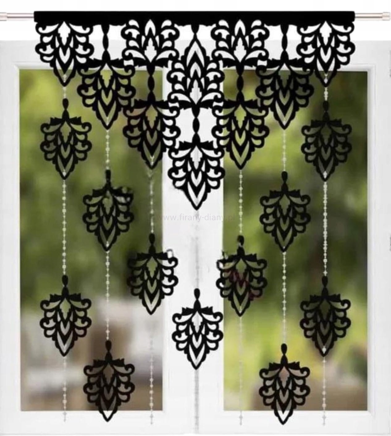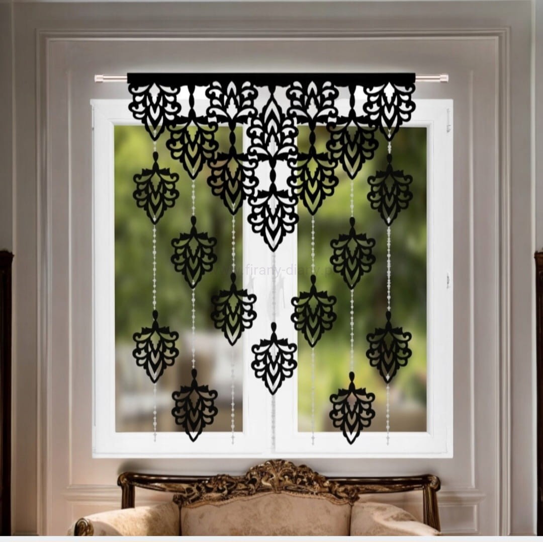 Czarny panel ażurowy z ozdobnymi koralikami. Stylowa dekoracja okna, która doda wnętrzu lekkości, nowoczesności i subtelnego blasku. Idealny na wąskie okna.