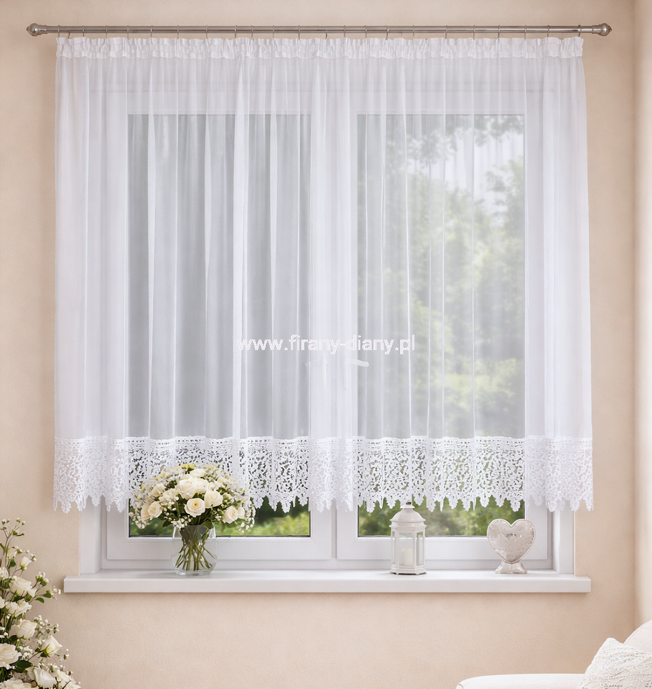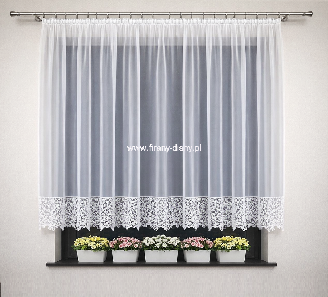 Firanka uszyta z woalu delikatnie kreszowanego w kolorze białym. Dół obszyty bawełnianą gipiurą o szer. 20 cm. Firana na taśmie marszczącej typu smok o szer. 5 cm, do wieszania na żabki i haczyki. Uniwersalna firana do salonu, kuchni i jadalni.