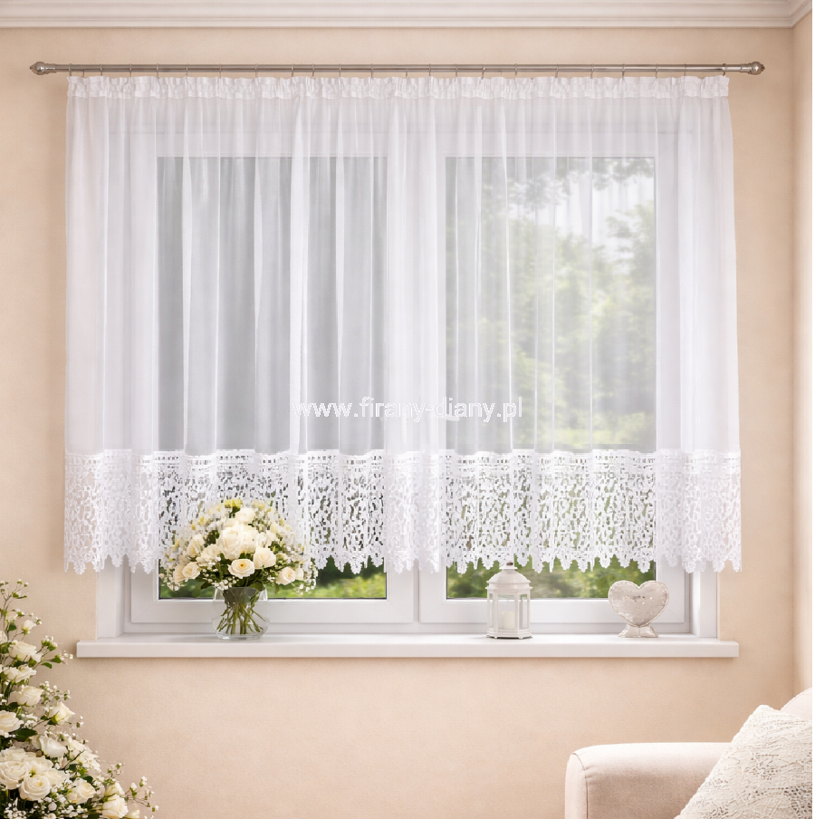Prosta firana z gipiurą 30 cm – klasyczna elegancja