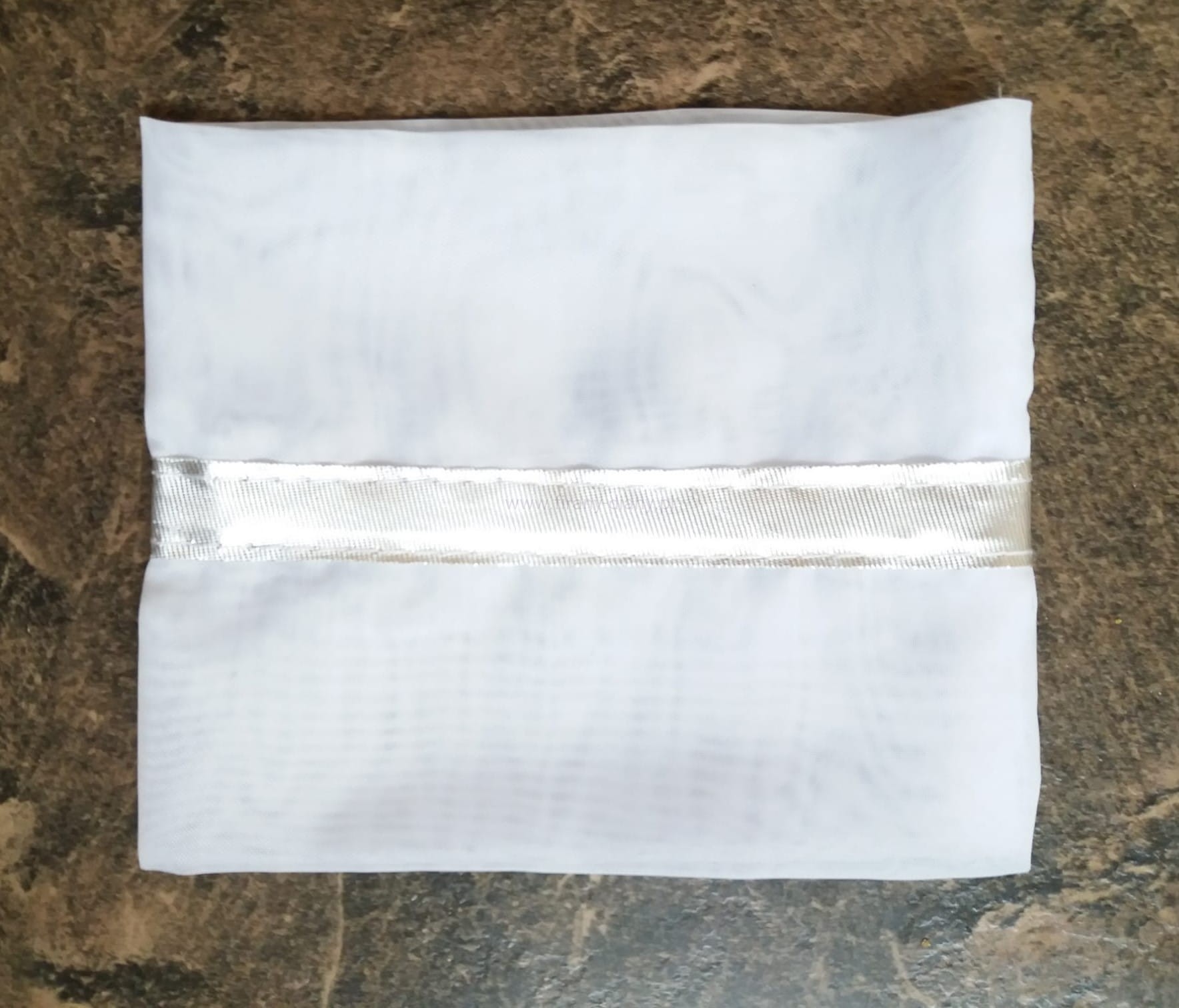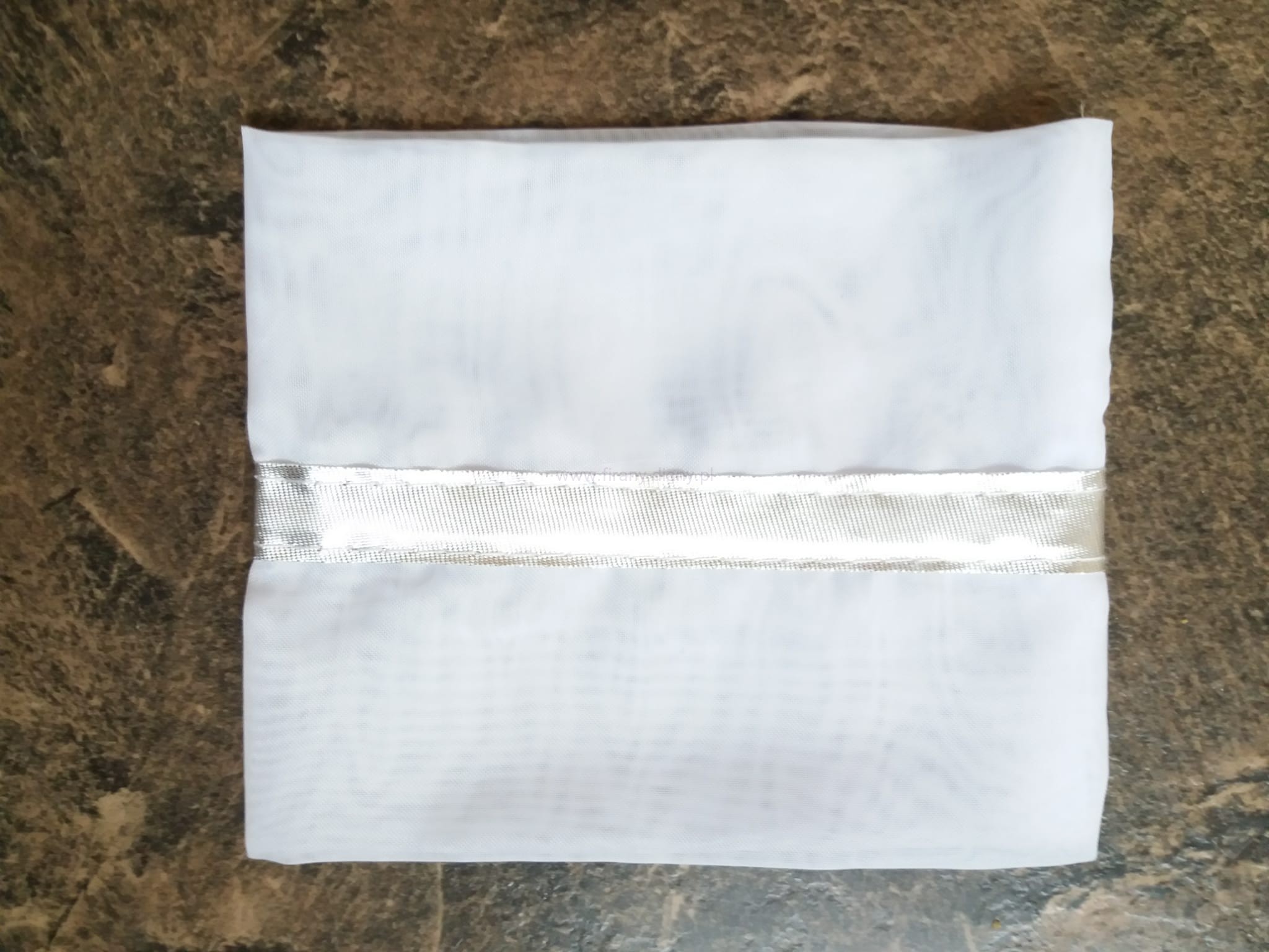 Tubka z woalu gładkiego w kolorze białym do upinania firan. Opaska na środku ozdobiona srebrną lamówką