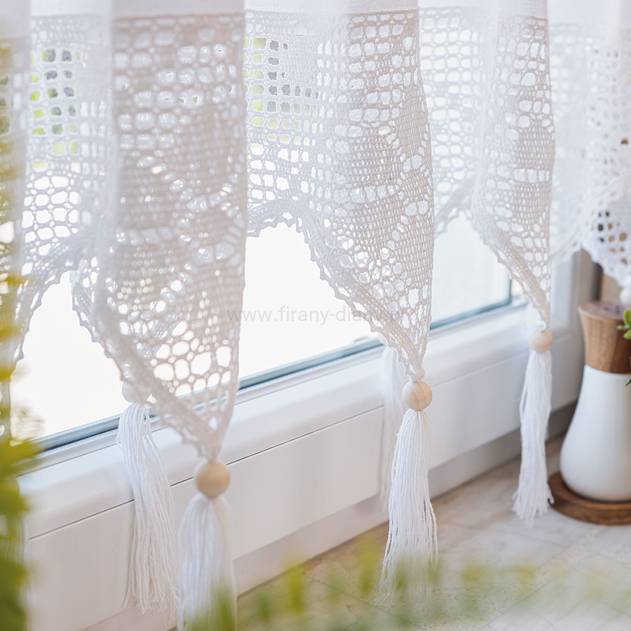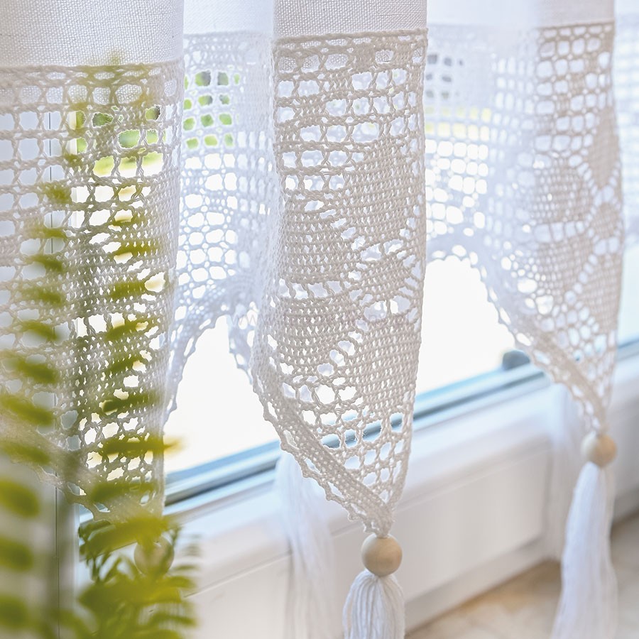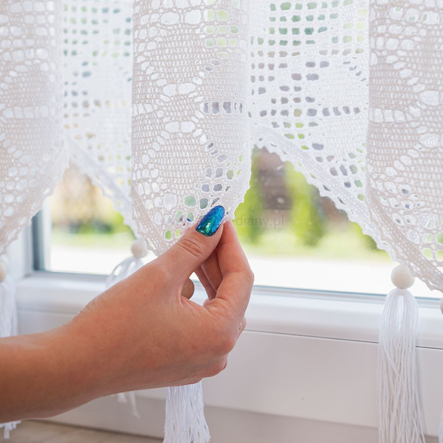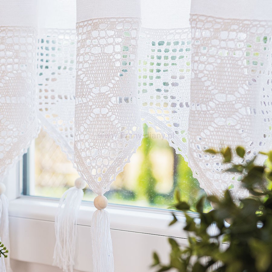 Biała zazdrostka lnianopodobna z praktycznym tunelem na patyczek lub karnisz to stylowa i funkcjonalna dekoracja okna. Naturalna struktura materiału pięknie rozprasza światło, wprowadzając do wnętrza przytulny klimat. Dolna część została ozdobiona szydełkowym wzorem z frędzlami i dekoracyjnym koralikiem, co nadaje całości subtelnej elegancji.
