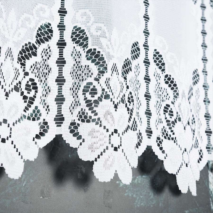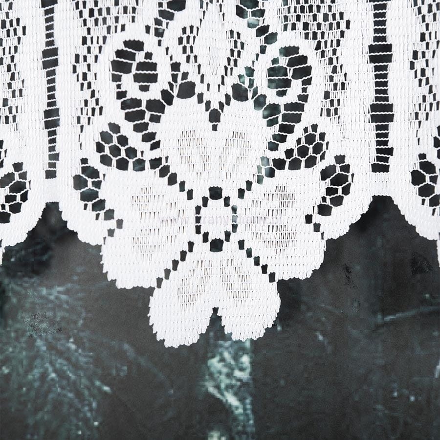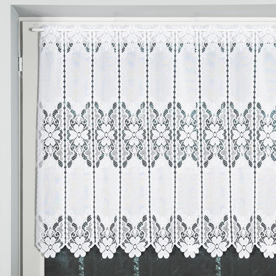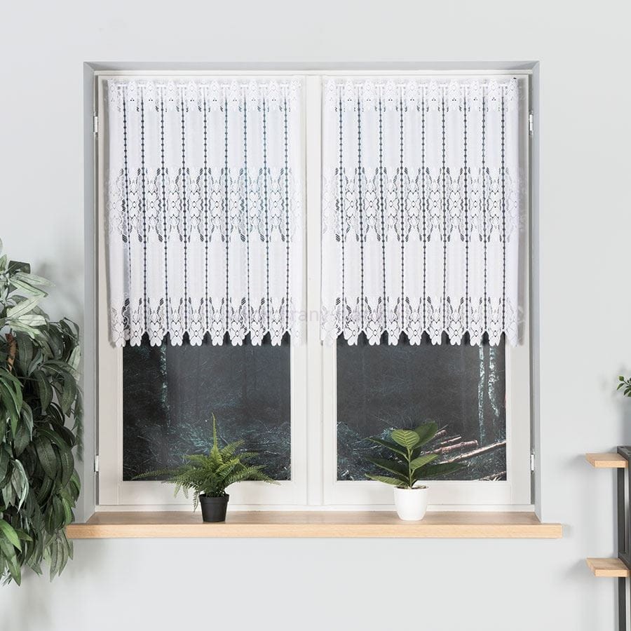 Zazdrostka żakardowa panelowa w kolorze białym o wysokości 90 cm stanowi wyraźny element dekoracyjny okna, jednocześnie skutecznie osłaniając jego dolną część.